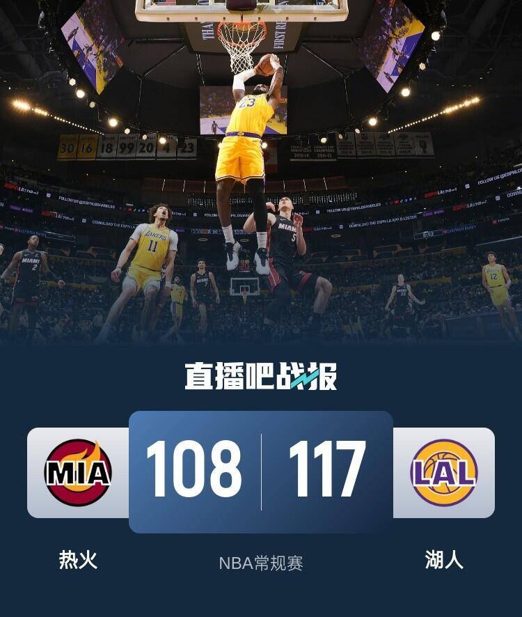 比赛上来,两队就大打对攻战,场上比分也是交替领先,首节合计拿到了72分,其中希罗5中5高效砍下16分,次节双方的命中率都出现下滑,但显然湖人的表现更糟半节只拿到7分,热火一波10-0的攻势将分差拉开到两位数,半场结束时湖人落后12分;下半场回来,热火的进攻出现了大问题,单节只拿到19分,湖人则在詹姆斯的带领下发起反扑,三节结束时分差仅剩2分,末节湖人的势头还在继续,他们一波9-0的小高潮成功实现反超,关键时刻詹姆斯连拿七分直接收比赛,最终湖人力克热火结束三连败。