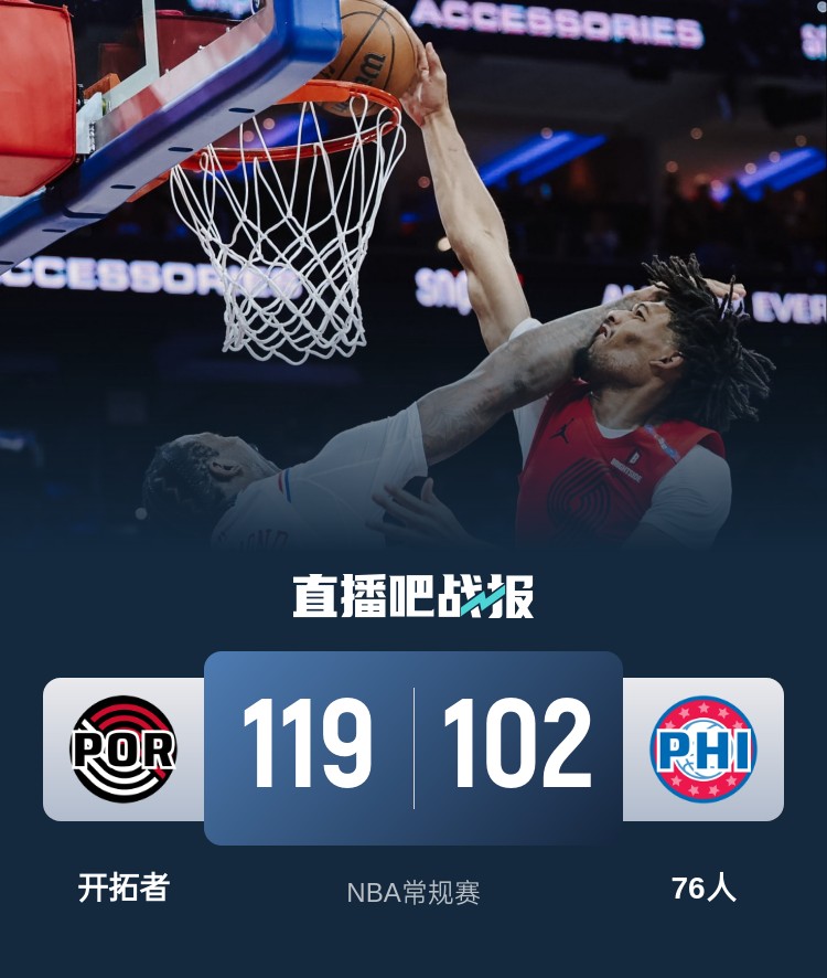 比赛开始,76人率先打出7-2开局,随后马克西、亚布塞莱和爱德华兹接连外线发炮,76人领先到双位数,但开拓者全面皆兵接连外线回应并一度追平比分,次节朗尼-沃克带领76人替补重新拉开双位数领先,安芬尼-西蒙斯接连三分止血,随后庄神内线大杀四方帮助球队守住5分优势。下半场,安芬尼-西蒙斯里突外投连砍9分带队14-3反超比分,马克西摔伤背部回更衣室,格莱姆斯带队追分,但开拓者三节还领先10分,末节双方展开拉锯战,夏普接连反击,克林根篮下连续吃饼,开拓者始终保持10分左右领先,最终开拓者119-102力克76人。