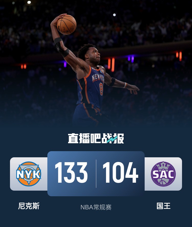 比赛开始,双方上来各自通过暴扣开局,你来我往比分很胶着,麦克布莱德状态火热内外线弹无虚发单节轰下15分,尼克斯顺势领先到15分,次节尼克斯继续发力拉开20分以上领先,国王10-0迅速止血回应,但唐斯和阿努诺比连续反击再次拉开比分,半场尼克斯领先15分。下半场,国王继续追分,尼克斯外线接连3记三分强势稳住局势,随后尼克斯外线继续发炮领先到近30分,末节双方继续拉锯战,尼克斯发力拉开30分以上领先,双方逐渐换上替补练兵,最终尼克斯133-104轻取国王,终止3连败。