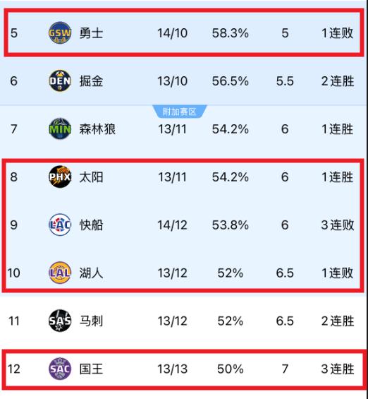 勇士虽然在第五,但比身后的掘金和森林狼仅多0.5和1个胜场。