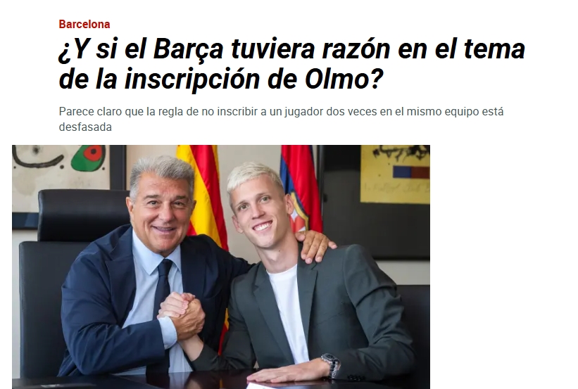 《马卡报》标题为“如果关于奥尔莫注册一事巴萨是对的怎么办?”,认为球员不得在同一球队两次注册的规则已经过时。