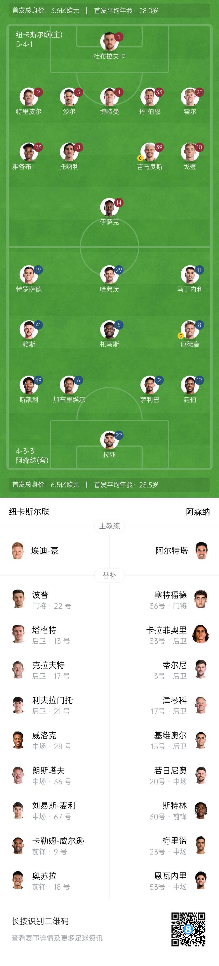 纽卡首发:1-杜布拉夫卡、2-特里皮尔、4-博特曼、5-沙尔、33-丹-伯恩、39-吉马良斯、8-托纳利、20-霍尔、23-墨菲、14-伊萨克、10-戈登