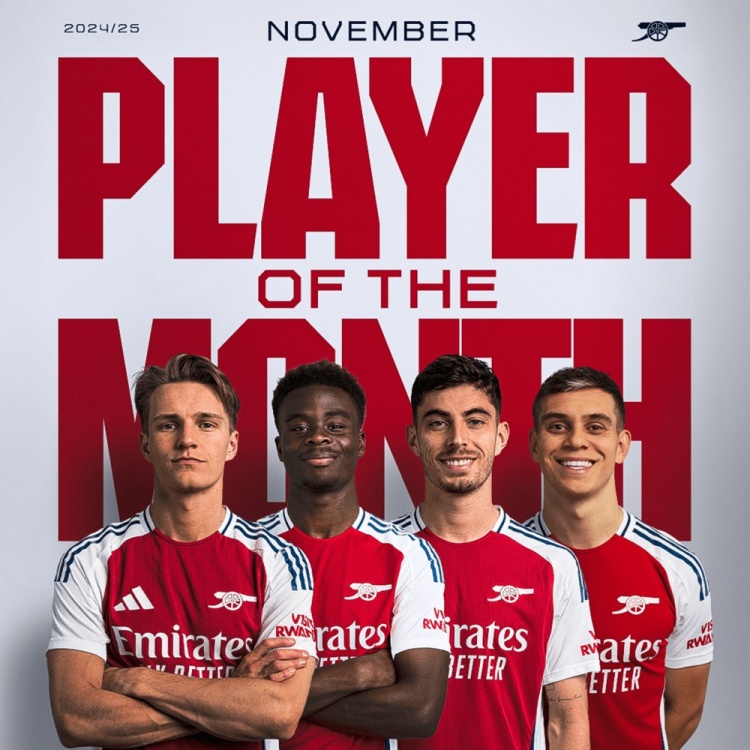 12月3日讯 随着11月的赛程全部结束,阿森纳公布了队内月最佳球员的候选人,分别是厄德高、萨卡、哈弗茨和特罗萨德。