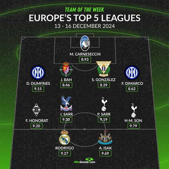 12月17日讯 本周五大联赛已经完赛,whoscored也列出了本周五大联赛评分最佳阵容,罗德里戈、孙兴慜领衔。